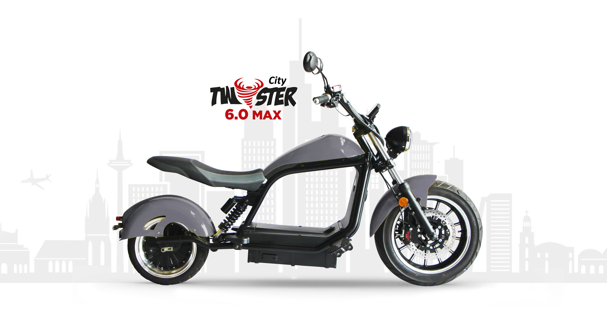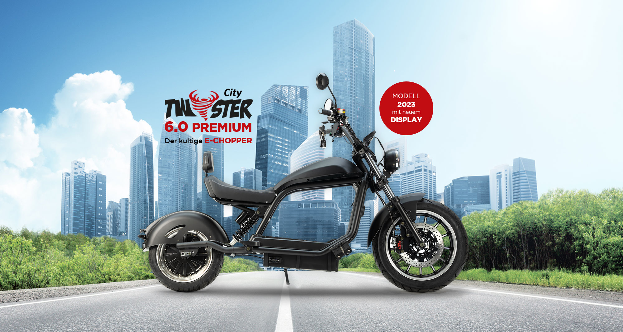 E-Chopper CityTwister 6.0 PREMIUM, LED-Scheinwerfer, Straßenzulassung, 3000 Watt, herausnehmbarer Lithium-Akku 60V/56,5Ah: bis 80 km Reichweite, Schnellladegerät, 45 km/h.
