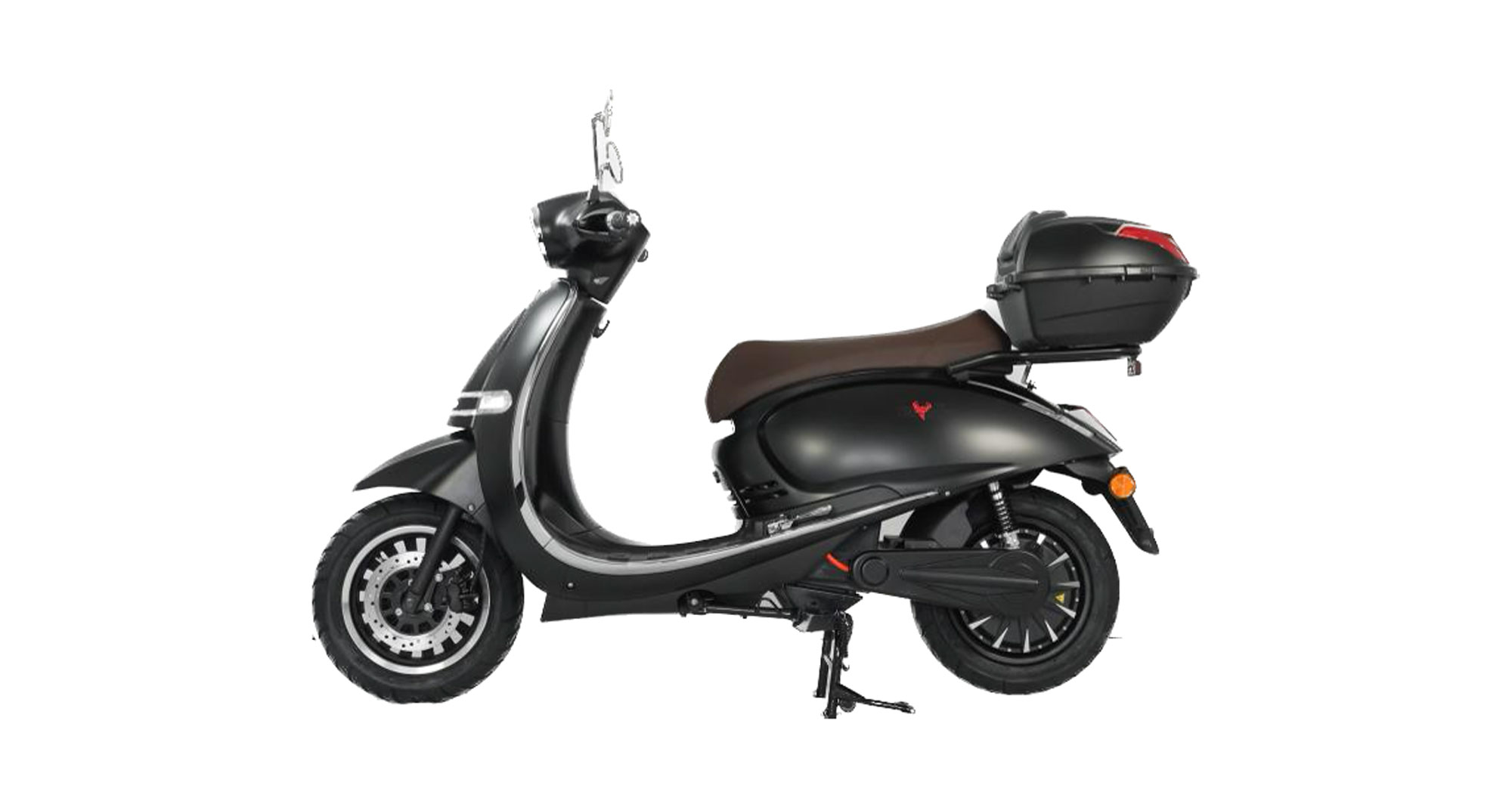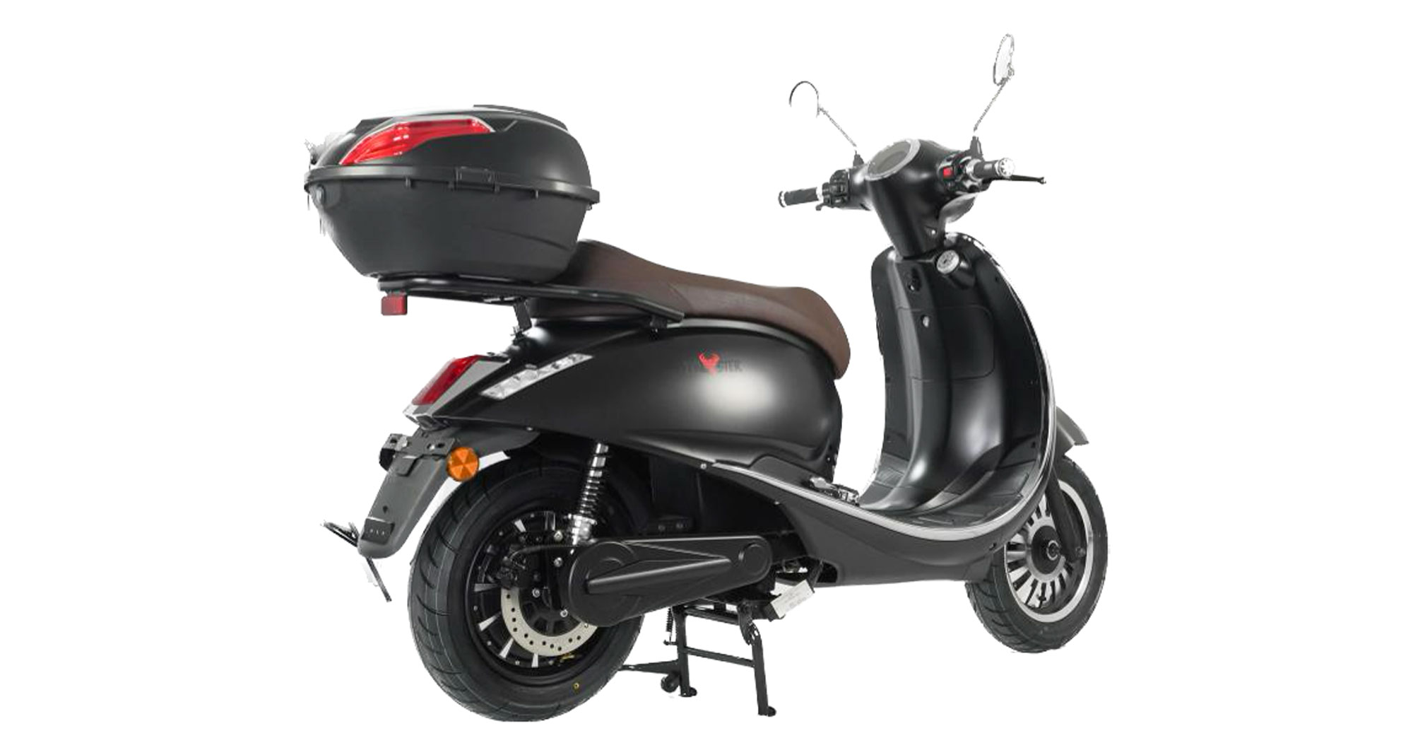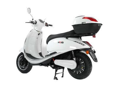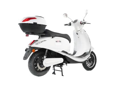 Der Lithium-Akku kann über einen Steckeranschluß im Seitenfach auch alternativ im E-Roller aufgeladen werden. Inkl. Topcase in Fahrzeugfarbe und Halterung.