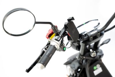 Der vollgummierte Gasgriff gewährleistet bei jedem Wetter guten Halt. Mittels Drehen am Gasgriff können Sie über die Steuerelektronik exakt die Geschwindigkeit des CityTwister Elektroscooter regulieren. Der rote 3 Stufen-Fahrstufenschalter hilft Ihnen, Drehmoment und Leistung vorzubestimmen um sportlich oder sparsam zu fahren. Mit der Fernbedienung können Sie die Alarmanlage bzw. die Wegfahrsperre ein- oder ausstellen.